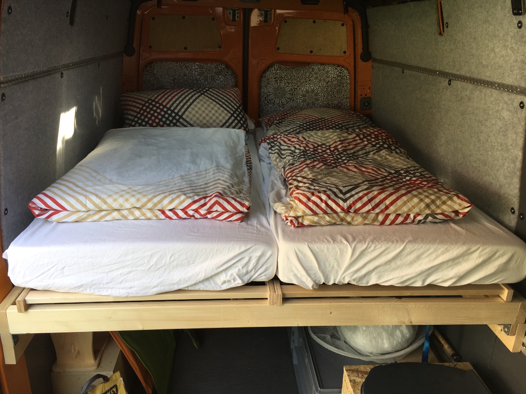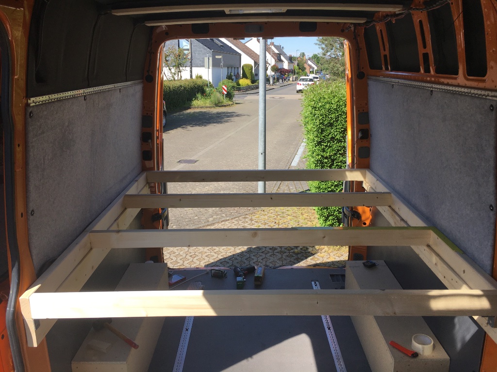 Weiter ging es dann mit dem Bett, vom ersten Balken, verschraubt mit der Airlineschiene bis zum fertigen Bett mit Lattenrosten und Matratzen in Längsrichtung. Breite 160, Länge 180… Leider bei einem L2 nicht mehr möglich als Festbauversion. Da ich aber über 190cm groß bin, gibts die Option über dem Küchenbereich um 20cm, einhängbar bei Bedarf, zu verlängern. Ist aber aktuell noch im Bau…