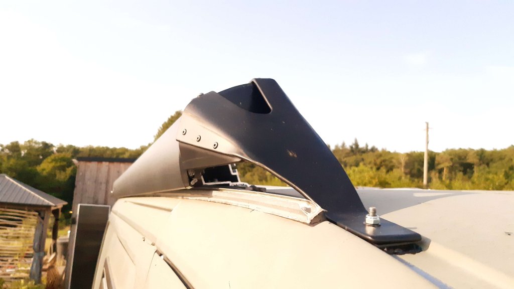 ... so sieht er nun aus, der Astabweiser. 3mm Alublech, pulverbeschichtet, mit M5-Nietmuttern an der Markise befestigt. Dazu in der Verlängerung der Sicke einen Flachwinkel + 6mm-Schraube mit Sika 554 befestigt. Dadurch ist der Astabweiser nicht dauerhaft montiert, ggf kann eine zerbrochene Abschlusskappe der Thule-Markise ersetzt werden. Merci für die Anregungen!