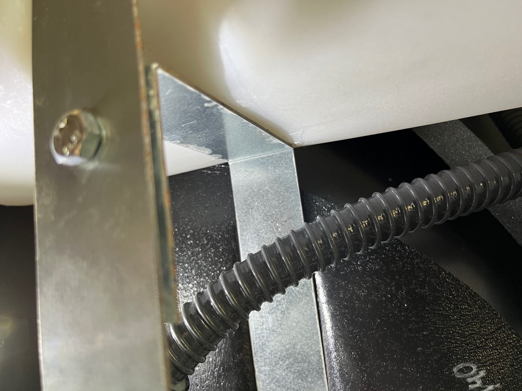 Nach einigen YouTube-Recherchen habe ich den Riss so gut es ging mit einem Streifen LDPE und einem 60-W-Lötkolben geschweißt. Anschließend habe ich die Halterung zusammen mit einer Silikonmatte und einem Gummiband wieder unter den Tank montiert.