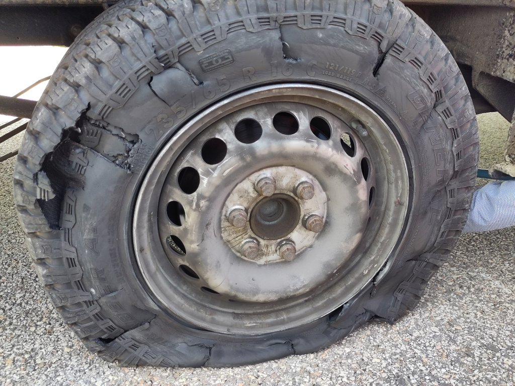 So wie ich das sehe ist der Reifen hinten rechts und vorne rechts geplatzt? Müsste ein Pritschenfahrzeug , evtl mit Wohnkabine sein?
