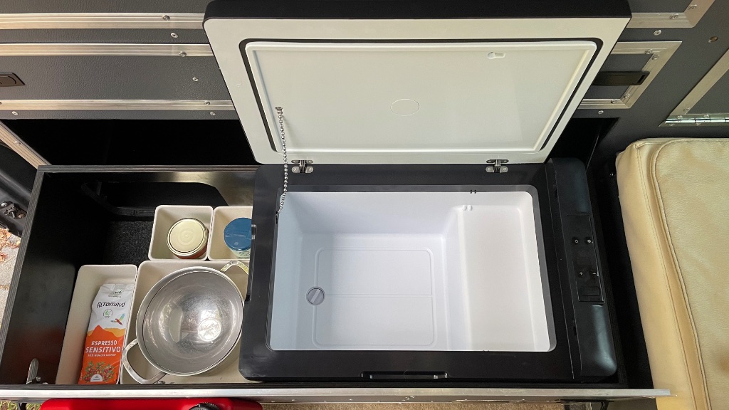 Die Kühlbox sieht an ihrem Platz mit den Staukästchen daneben schon so exakt aus,
