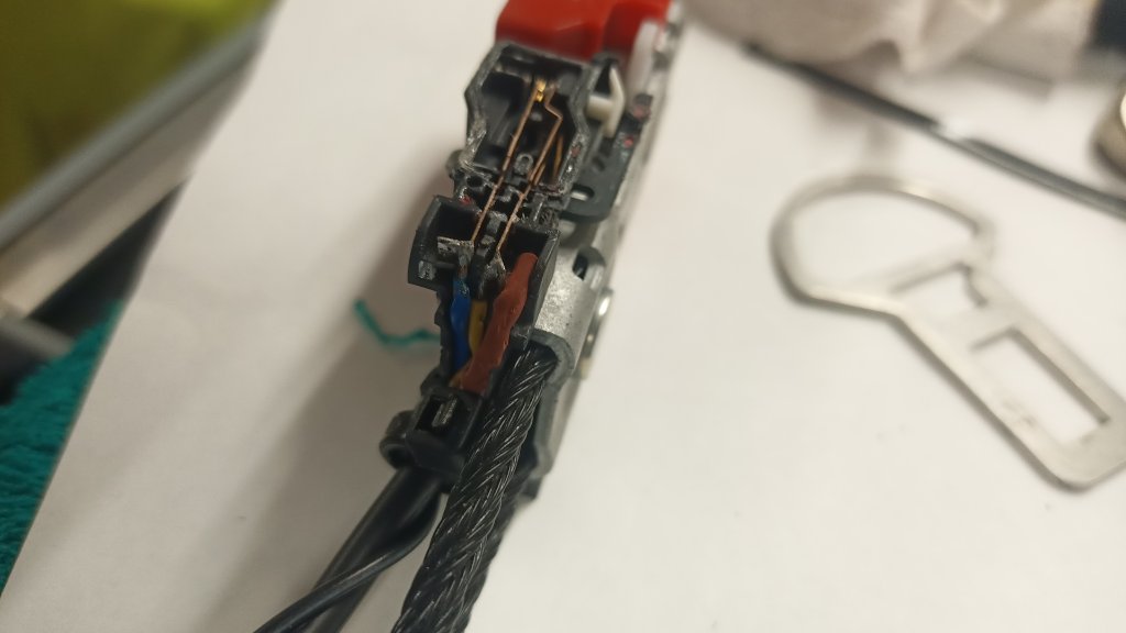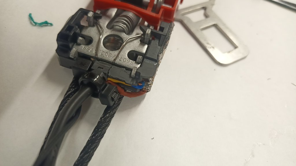 das hab ich durch testen ausprobiert. Nun habe ich das alte Gurtschloss vom Einzelsitz (offen = 400 Ohm, geschlossen 100 Ohm) geöffnet und erstmal das Anschlusskabel an den zwei "blanken Presspunkten" entfernt (dort wo ich nachher das kabel wieder angelötet habe), dahinter sitzen wohl irgendwie die Widerstände (für die 400/100 Ohm Werte). Nun habe ich erstmal einen einfach Schalter, der schließt wenn das Gurtschloss drin ist.