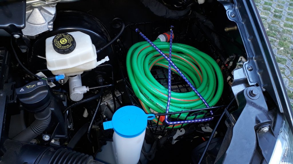 Im Motorraum habe ich statt der AGM-Batterie ja jetzt wunderbar Platz für eine Werkzeugablage, Alukiste oder dergleichen.