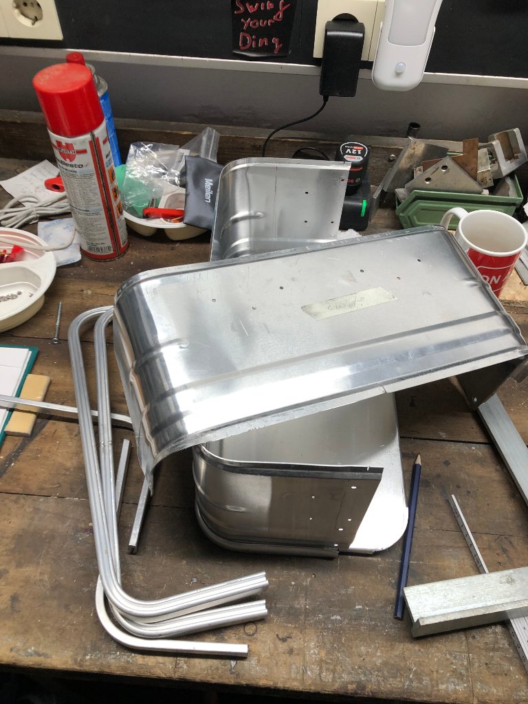 Zu guter Letzt habe ich mir eine halbwegs passende Alubox E18 gekauft und diese ganz wunderbar massakriert. Also alle Nieten ausgebohrt, Die Kiste zerlegt, 65mm an Box und Deckel rausgeschnitten und wieder (so gut es ging bei 1mm Blech) zusammengeschweißt und genietet. Den originalen Batteriehalter habe ich entfernt und gleich einen neuen Halter aus Aluresten zusammengebastelt (eine freundliche Spende aus einem alten Wintergarten). Nicht lackiert, sondern nur gestrahlt. Die Schutzschicht kriegt das Alu alleine hin. Das Ganze (also Box und Halter) ist jetzt sogar leichter als der originale Batteriehalter alleine.