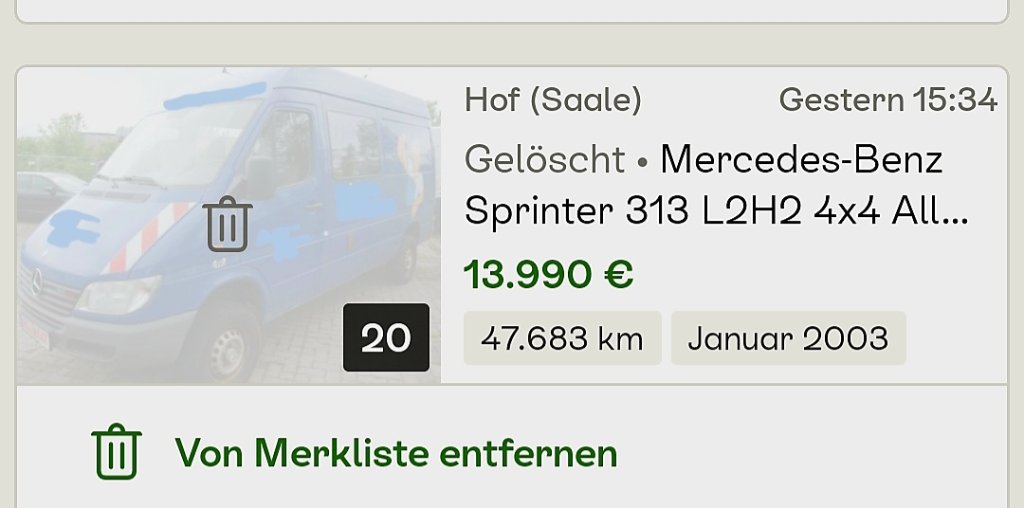 Die Namen IGLHAUT, OBERAIGNER, MANTRA wurden viel zu überbewertet und jetzt steht da das Riesentrumm und wird zur Last. Mercedes G-Klasse: gehypt, bis die Blase platzte. Toyota HZJ/HDJ mit 300.000km - na aber! Neupreis her! LR Defender? Für den doppelten Neupreis Autos mit 200.000km, als Solihull die Produktion des alten Defis einstellte. Und jetzt? Muss der Oldie weg und kein Dummer ist morgens aufgestanden, auch wenn man die Annonce noch so oft nach oben schiebt. Im Gegenteil: jeder, der den Markt beobachtet, sieht den Kursverfall und wie die Reihe der Standuhren jeden Tag aufgezogen wird. Um einen reellen Preis zu erzielen, wäre ebay eine gute Möglichkeit. Da gibt's dann den tatsächlichen Marktwert wie letzte Woche für 9900€ einen 3,5to Iglhaut Sprinter mit 340.000km. Ein realer Preis. Aber das ist selten. Die vielen anderen unverköuflichen Exemplare werden weiter aufgezogen.