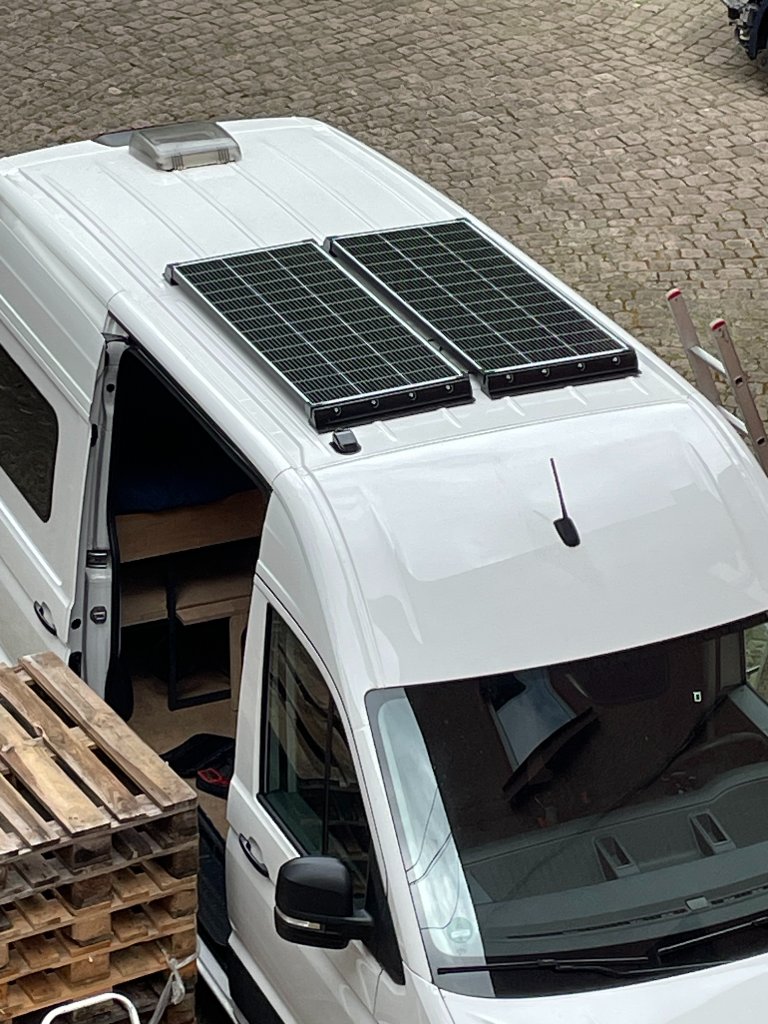 Also ich habe einen Crafter "im Ausbau" und habe mir nun 2 Solarpanels von Offgridtec sowie den dazugehörigen ABS-Spoilern zugelegt. Die Spoiler erwarten ja eine ebene Unterfläche, das Crafter Dach hat ja sehr breite Sicken und ich wollte gerne die Spoiler auf dem Sicken-Niveau verkleben. Dafür müsste man aber die Spoiler bearbeiten und gem. der Kontur des Dachen die Anteile heraus fräsen. Je 60 cm breite Spoiler wären das 2 x 3 cm breite Nuten die heraus gefräst würden. Auf dem Bild sieht man die aufliegenden Solarpanels mit Spoilern, die noch nicht bearbeitet worden sind.