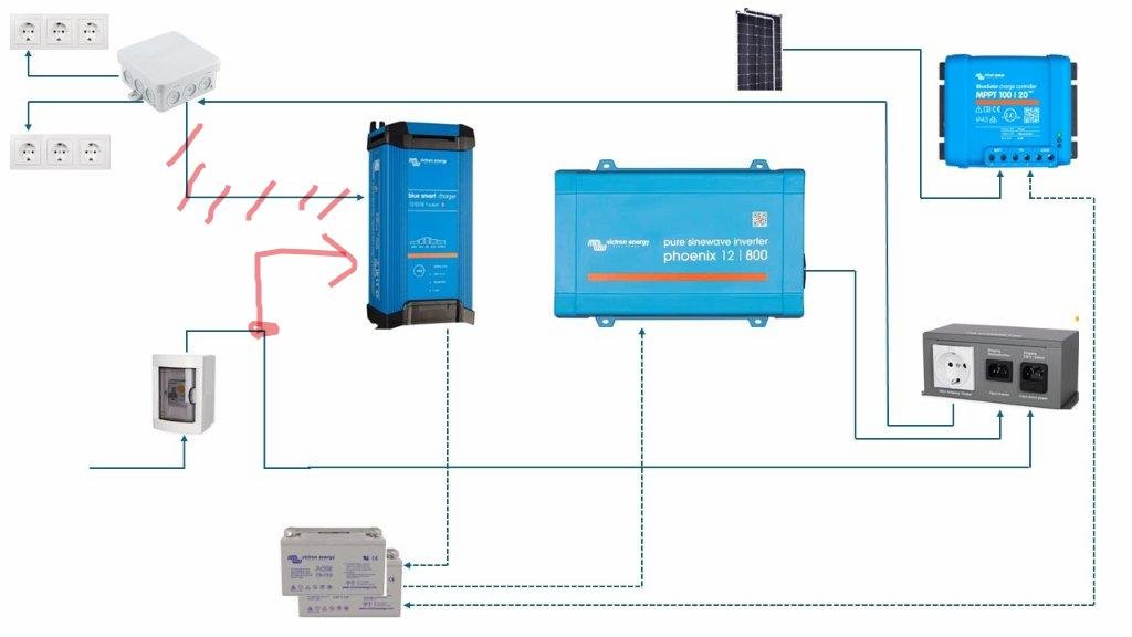 Ihr habt sinnbildlich gesprochen das 220V Ladegerät als Verbraucher in den Wechselrichterstromkreis eingebunden (von Steffen durchgestrichene Leitung).