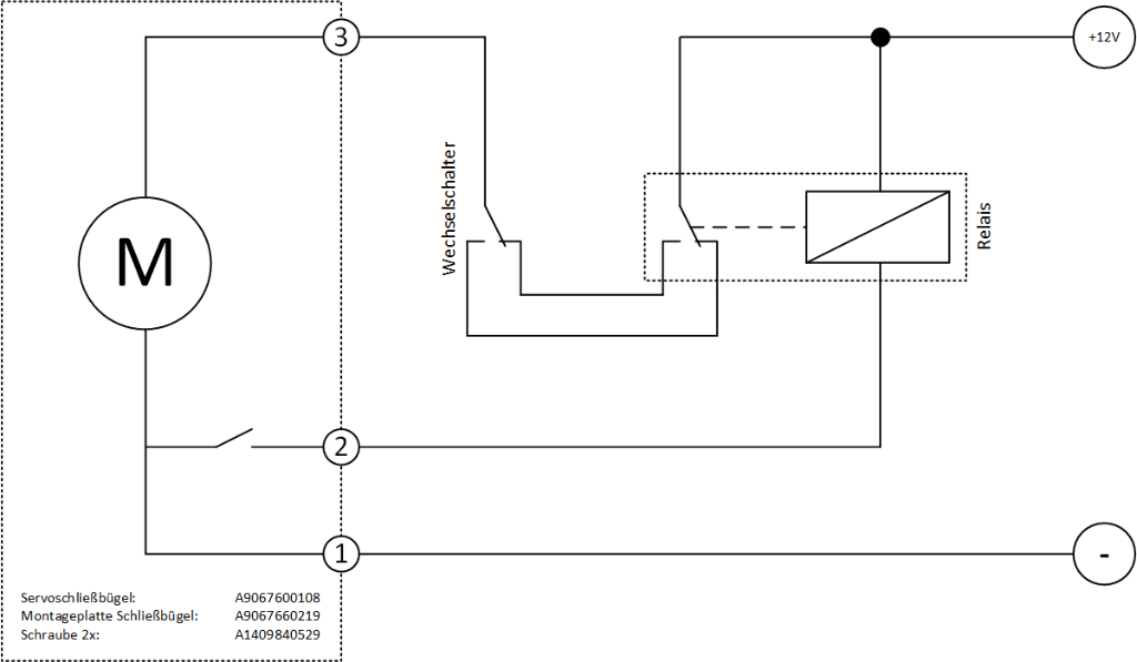 Mit einer einfachen Wechselschaltung (1x Relais und 1x Wechselschalter, siehe Anhang) kann man durch einen Knopfdruck den Schließbügel ausfahren lassen bzw. beim erneuten drücken einfahren lassen.