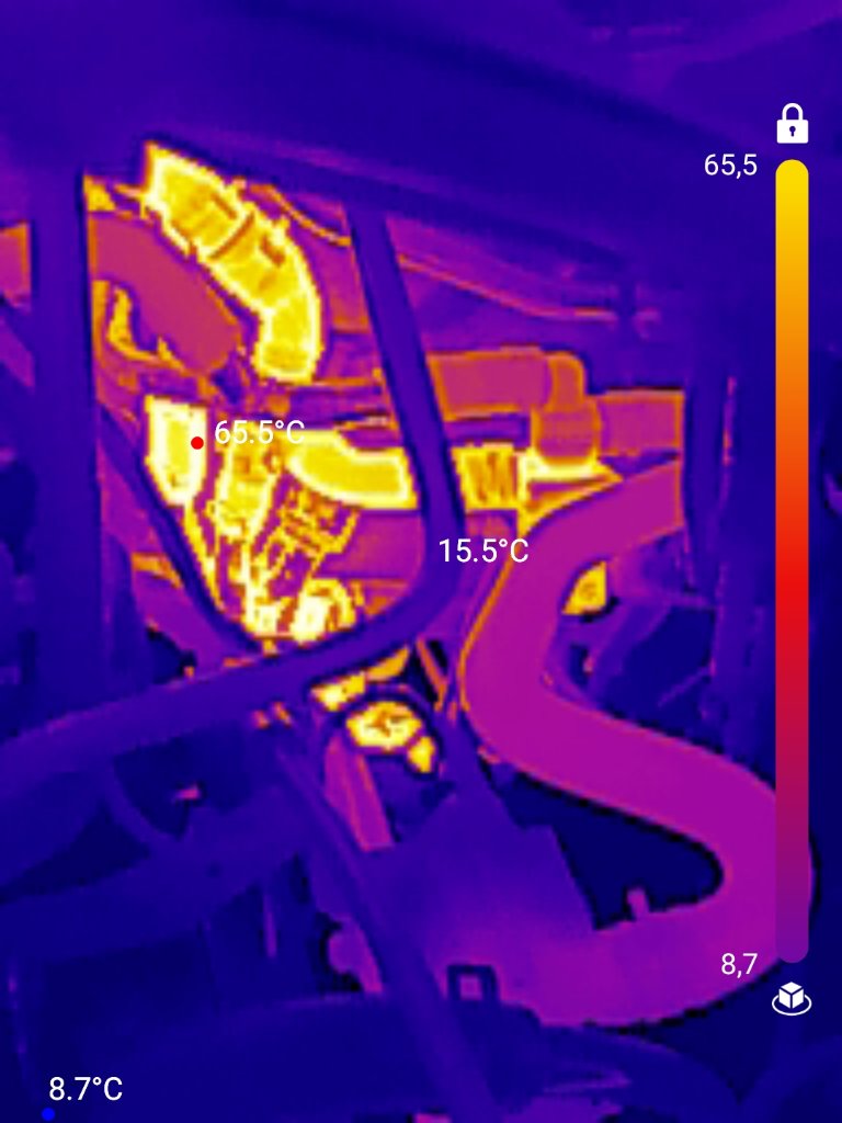 Die Thermalbilder zeigen deutlich, dass das heisse Wasser nicht durch den Verteiler unterm dem BKV geleitet wird und auch die dahinterliegende Pumpe nicht arbeitet.