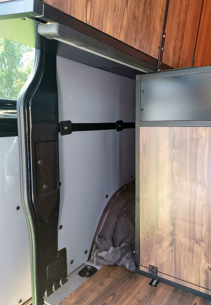 Es sollen jeweils Füll und Entnahme Anschlüsse auf Seite der Schiebetür und auch der Hecktüre sein.Im Heck für einen Duschschlauch,bei der Schiebetüre für einen Duschschlauch und eine Leitung zu einem Waschbecken.Das Waschbecken ist im Möbel mit der schwarzen Abdeckung eingebaut.Als Grauwassersammler würde ich darunter einen grösseren Plastikkanister verwenden,mit Wasserzufuhr durch einen Schlauch im Deckel.Dieser steht in einer ausfahrbaren Eurobox.Sollte da also mal trotz Dichtung was rausschwappen,wär es einfach in der Eurobox..Wenn immer möglich wird aber das Wasser ausserhalb des Sprinters mit den Duschschläuchen benutzt.