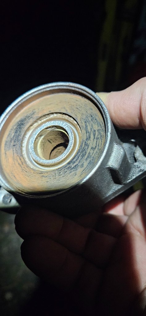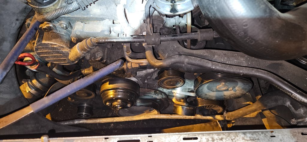 Zum Glück hatte ich einen neuen Riemen und den alten Spanner noch im Auto und der gerissene Riemen hatte sich diesesmal nicht in die Wasserpumpe reingewickelt. Ist dieses Mal auch im Leerlauf und nicht bei 3500 U/min passiert.