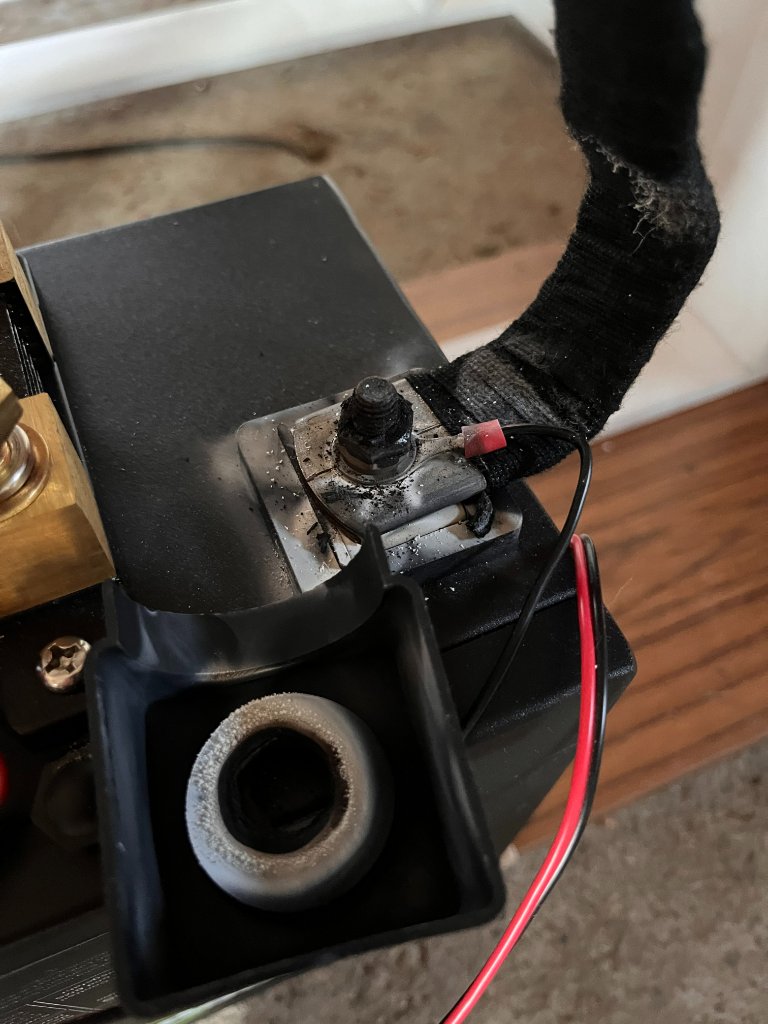 Ich sehe rings um den Bolzen Abbrand. Das hat da also bereits gefunkt. Ursache könnte eine gelockerte Mutter gewesen sein. Weiter muss ich die viel zu große Ringkabelöse monieren! No Go!!! Das Ding wird durch Anzug der Mutter (auf die vorhandene Oberfläche betrachtet) extrem belastet. Dadurch dürfte bei der Ringkabelöse ein gewisser Setzeffekt eingesetzt haben. Auf gut deutsch hat sich das Ding plattgedrückt, weil es viel zu schmal war. Ferner war dieser schmale Ring wohl viel zu klein, um die entstehenden Ströme zu übertragen. Durch den dann entstehenden Übertragenswiderstand entsteht ebenfalls Hitze.