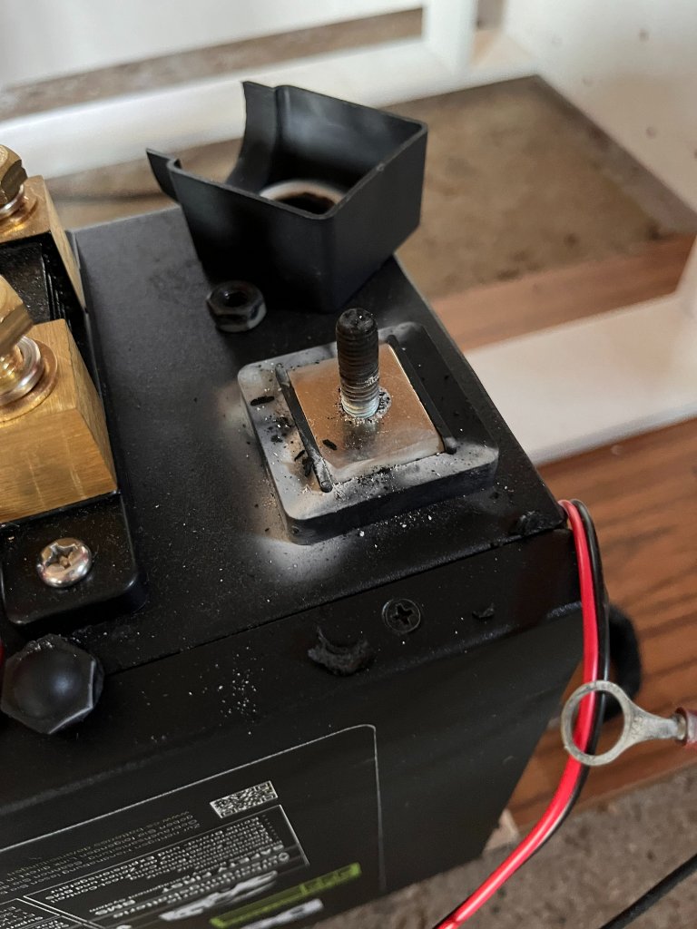 Sollte ein Stehbolzen aus Stahl verwendet worden sein, so kann sich durch unterschiedliche Wärmedehnung der Materialien die Verbindung gelöst haben und der Übergangswiderstand deutlich erhöht haben. Bei Ladung/Entladung führt dies zur Erwärmung der Übergangsstelle und verstärkt sich fortlaufend. Es konnte dabei zur Lichtbogenbildung gekommen sein.