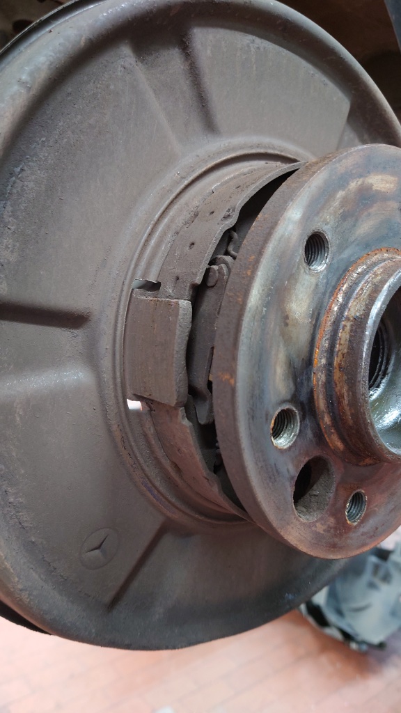 Jetzt, bei 65 mussten hinten die Beläge der Feststellbremse neu, weil nicht mehr vorhanden (siehe Foto), da kamen auch die Scheiben gleich neu.