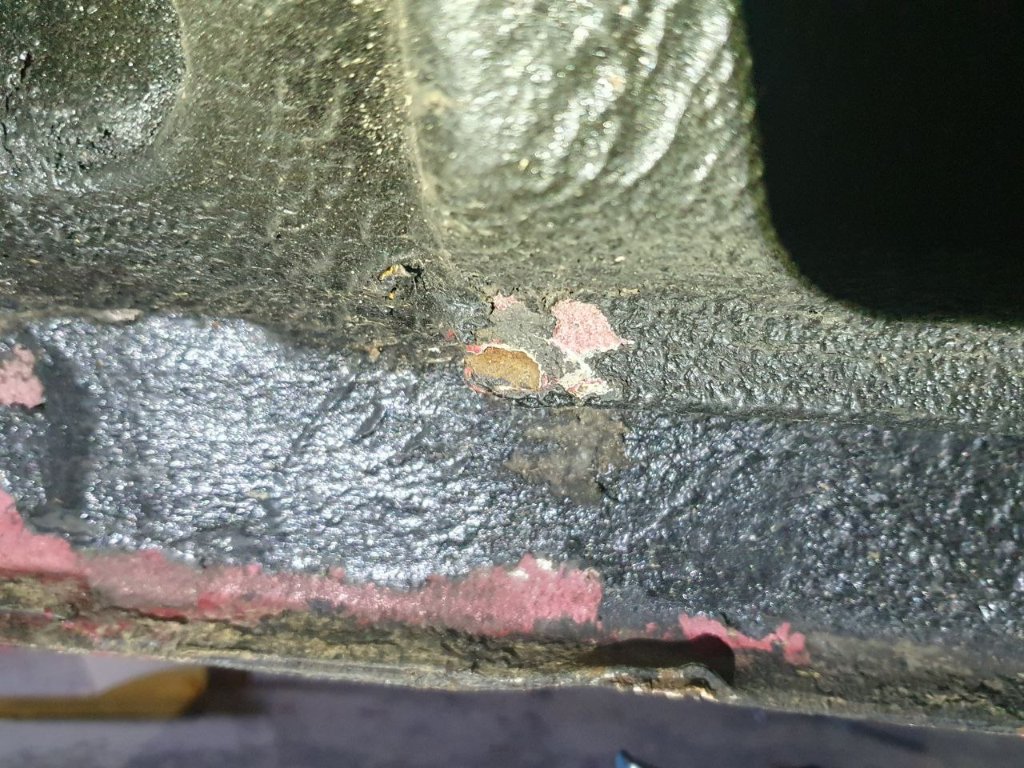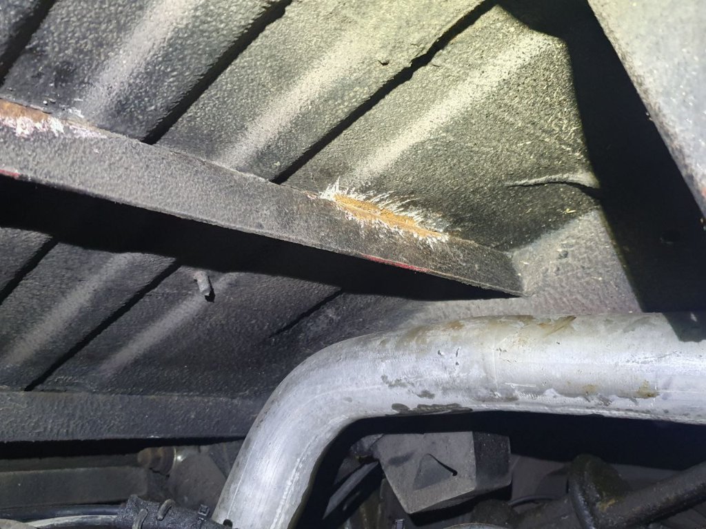 Soweit ich sehen kann, gibt es glücklicherweise keine Durchrostungen, der Unterboden hat eine schwarze, recht dünne und flexible Beschichtung, die sich an einigen Stellen löst. Der Plan ist, den Unterboden gründlich zu behandeln, um zukünftige Rostprobleme zu vermeiden.