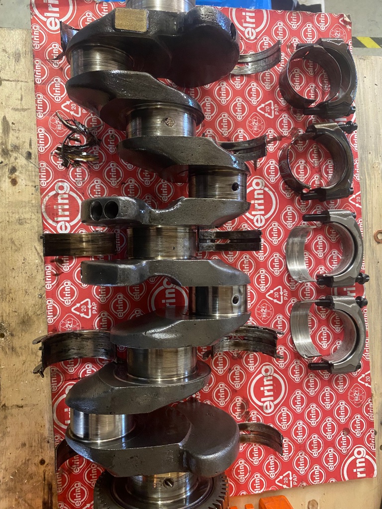 Wenn Du dein Motor schon vor Dir hast, Getriebe ab, Ölwanne(Beide Teile) ab und unbedingt die Kurbelwellen Lager und Pleuellager kontrollieren . Wenn du irgend eine Spur von "Verschliss" hast, Lager dringend Tauschen sonst hast Du nach kurzer Zeit sowas wie auf dem Bild.