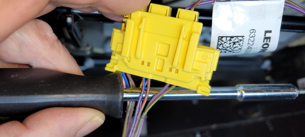 Es gibt auch noch einen Kabelstrang (auch für die Sitzheizung), an dem die beiden Stecker sind, die vorher am Gurtschloss angeschlossen waren. Da ich diesen Kabelstrang nicht mehr nutzen möchte, möchte ich die Widerstände direkt in den gelben Stecker stecken.