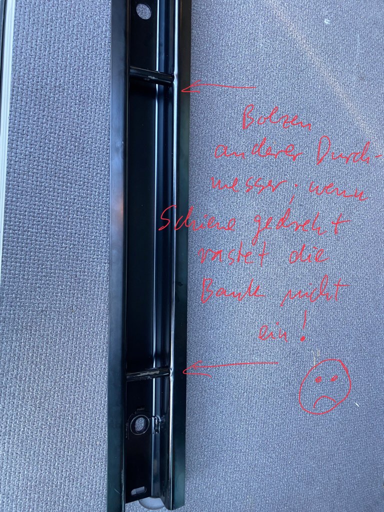Kannst du mal ein Bild davon einstellen ....Peter23 hat geschrieben: 20 Feb 2025 12:34 habe ich zusätzliche Bolzen in die Schienen geschweißt, habe somit zwei Positionen in welche ich die Sitzbank einrasten kann.