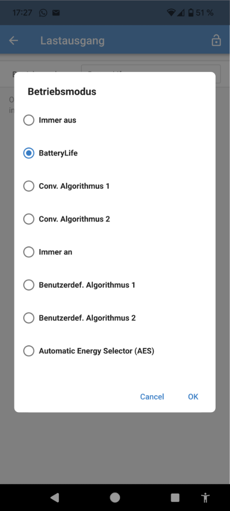 Bei richtiger Einstellung wird sogar die Stromabgabe, zum Schutz der Wohnraumbatterie, der Strom am Lastausgang abgeschaltet.