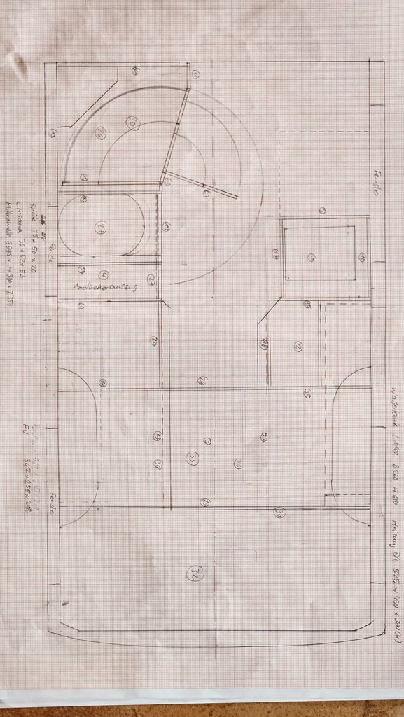 So wurde übrigens der Badschrank "gebogen". Die Idee habe ich ja von einem Berliner Ausbauer, der hat aber einen eckigen Schrank, der dann etwas kleiner ist.