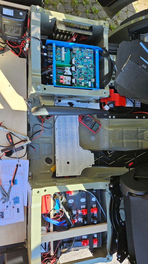 Unter dem Fahrersitz ist ein Frequenzumrichter 2,5kW und unter dem Beifahrersitz die Eigenbau Batterie mit 640 Ah, BMS und Ladebooster. Das sorgt für eine gute Gewichtsverteilung. Auf der Vorderachse liegt sogar ezwas mehr Last als auf der Hinterachse.