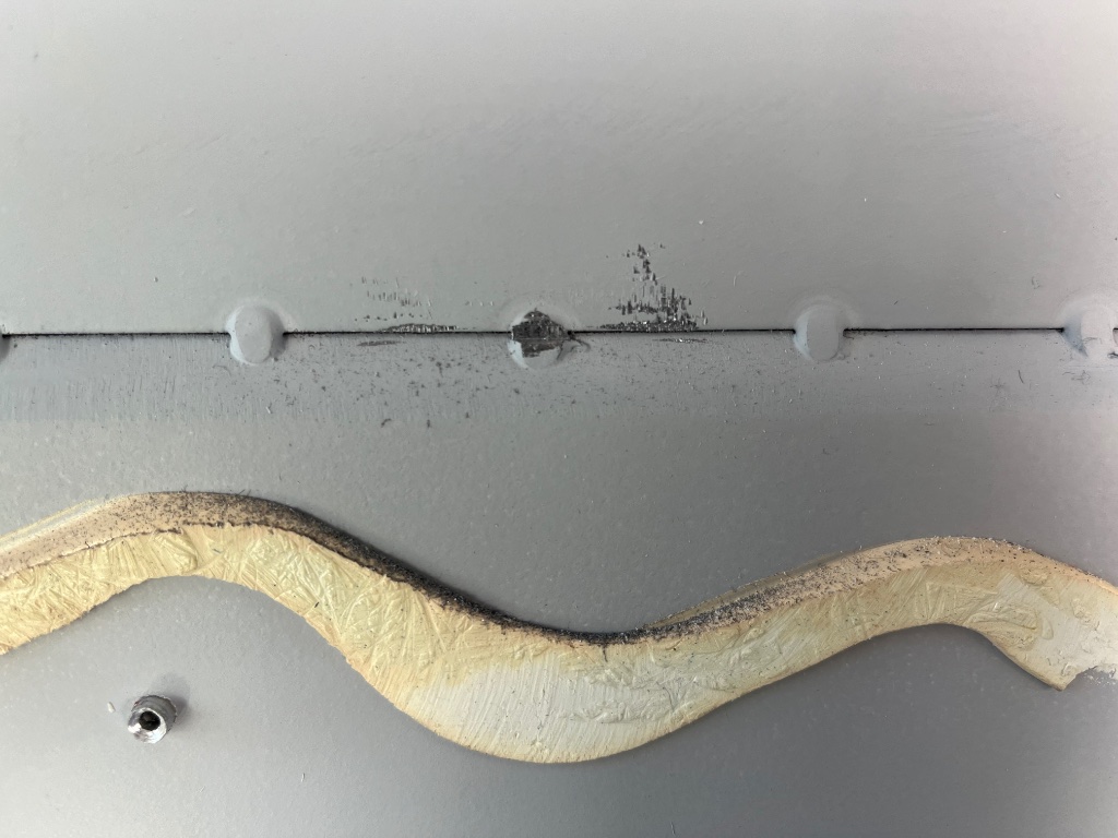 Dazu kurzes Metallblatt verwendet. Dort wo der Pendelhub der Stichsäge an der Außenhaut aufgeschlagen ist habe ich ein Stück Holz auf die Gleitfläche der Stichsäge geklebt um so die Hubtiefe des Sägeblattes zu reduzieren.