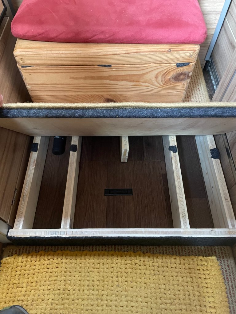 mit Restfilz die sichtbaren Flächen und Kanten beklebt und zum besseren Halt des draufliegenden Teppichs zwei Klettbänder angebracht die vordere Klappe kann man bis zur Kühlschrankklappe öffnen. Hätte ich die Klappe etwas kürzer gebaut und mittels eines festen Brettes die Breite unterm Kühlschrank erzeugt, wäre die Klappe natürlich weiter zu öffnen. Stört mich aber nicht.