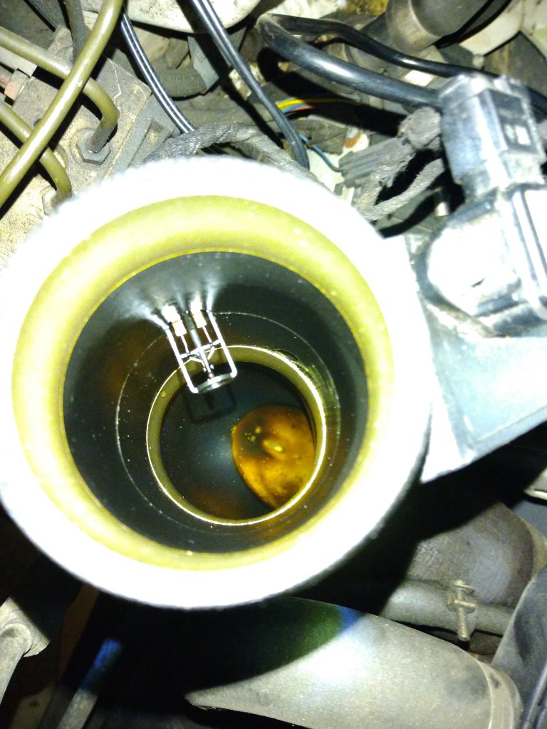 Vor kurzem hatte ich die Ansaugbrücke runter gebaut (zum Aus- und Einbau der Injektoren) - da war schon etwas drin und jetzt habe ich gesehen, dass der dicke Schlauch am Ausgang des Ladeluft-Kühlers damit voll ist. Ich habe versucht das zu fotografieren...