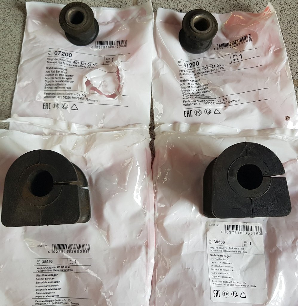 Nachdem Reparatursätze von Febi und Meyle für die inneren Lager nicht passend waren wegen den Lochabständen der Schellen, habe ich jetzt von Febi Gummiklötze bekommen, die in meine original Schelle passen.