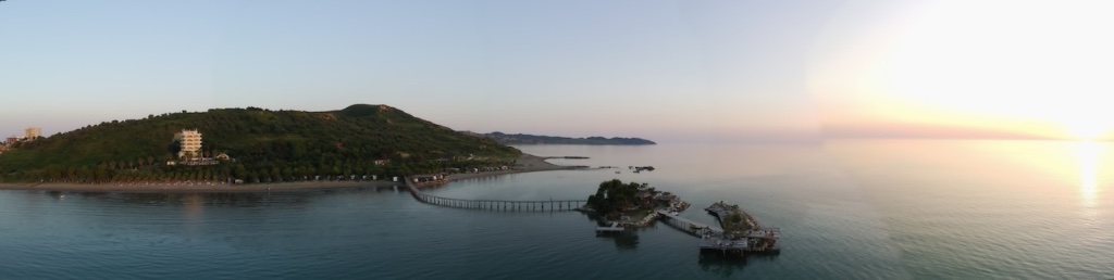 Heute gehen wir es ruhig an. Langes Frühstück, bisschen spazieren gehen und die Drohne darf ein paar Runden drehen. Wir kommen an riesigen Restaurantpalästen vorbei, wer braucht das hier am Ende der Welt ? Spontan fällt uns Geldwäsche, Mafia ein,Tirana ist nicht weit entfernt. Neben den Protzgebäuden stehen dutzende kleine Häuschen, sind das Übernachtungsmöglichkeiten für Betrunkene? Nein, weit gefehlt, es sind Esszimmerhäuschen für kontaktscheue Gäste.