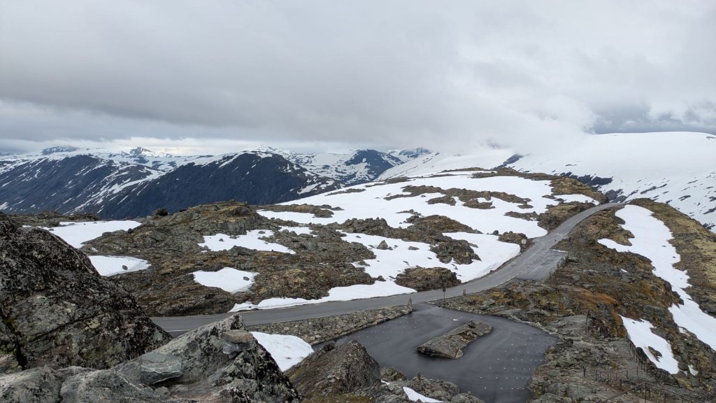 Mit Schneeberge ist dieses Jahr nix. Es liegt allgemein sehr wenig Schnee in den Bergen und hier oben besonders wenig. Vor 3 Jahren sind wir über den Gamle Strynesfjelvegen zum Dalsnibba und sind durch meterhohe Schneeschneisen gefahren, heute liegt dort und hier auf dem Dalsnibba, fast kein Schnee