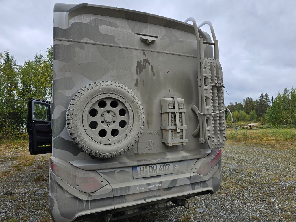 Man beachte das fette AT Reserverad, die Heckleiter mit angebrachten Bergebrettern (nicht serienmäßig) und die aufdringliche Folierung...