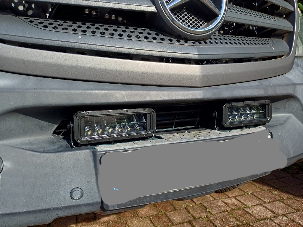 Die zwei Scheinwerfer sitzen auf einer 5mm Platte die an den oberen original Tritttstufenlöchern befestigt ist.
