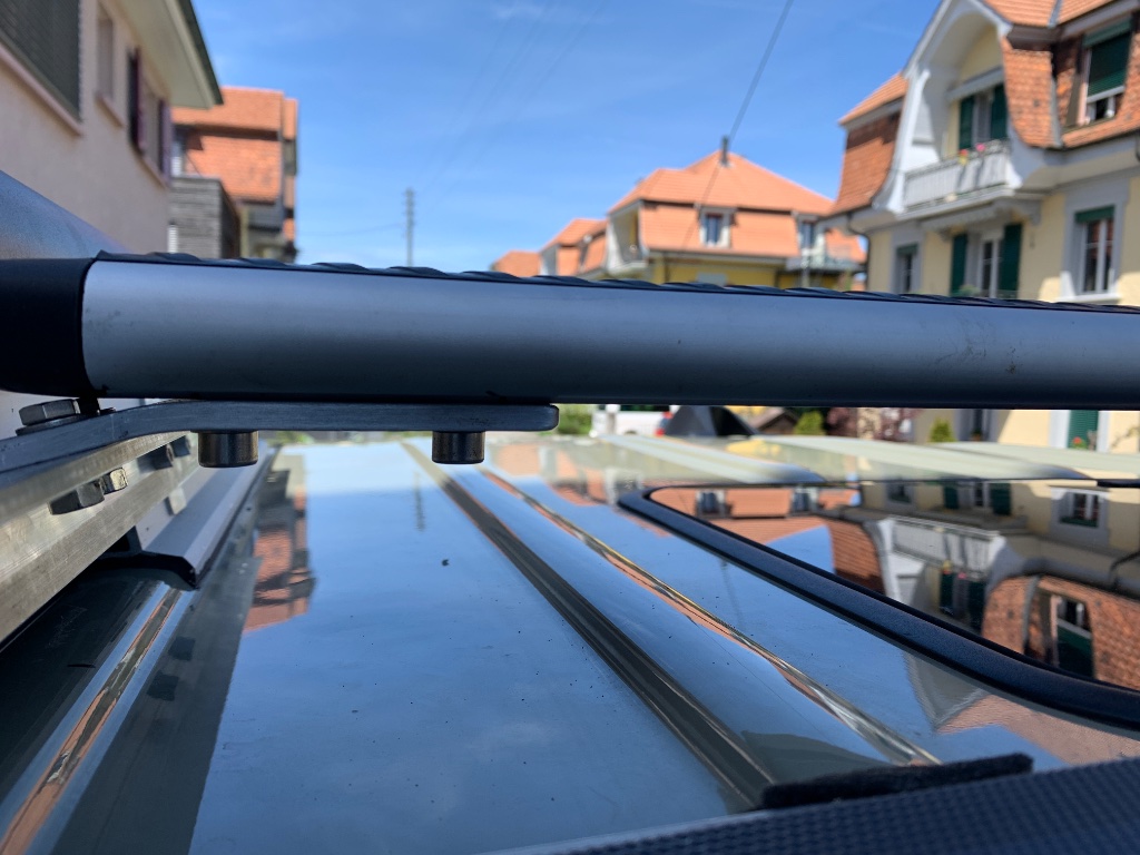Die Boschprofile haben einen 30x30mm Durchmesser und ich kann die Solarpanele auch leicht versetzen, da sich aber zwei Panele direkt nebeneinander befinden, ist mein Spielraum eingeschränkt, wenn ich nicht möchte, dass sie dann auf der Fahrerseite über das Dach hinausragen.