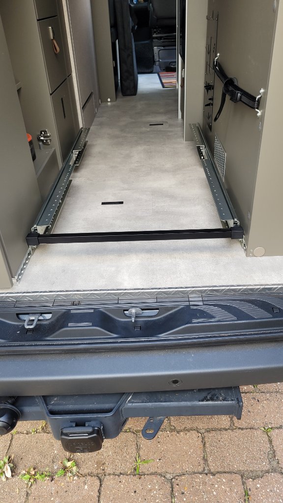 Das Thema Heckauszug bin ich nun angegangen. Bedingung ist, dass alles (1 Ausnahme) rückbaubar ist, also keine Bohrungen oder Verklebungen. Ebenso wollte ich mit vorgefertigten Bauteilen arbeiten. Es wurden dann Schwerlastauszüge bis 130kg mit den passenden Winkeln.