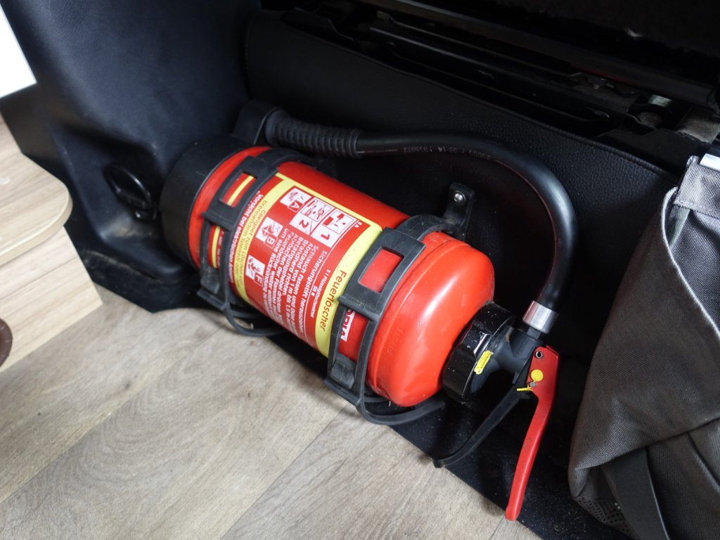 Nachdem ich jahrelang in den Firmenfahrzeugen den Löscher meist vorne unter dem Fahrersitz hatte (nicht immer, je nach Sitzmodell), habe ich mich beim Camper umentschieden und ihn in der Nähe der Küche platziert. Einmal nach rechts bücken und zugreifen und ich hab ihn.