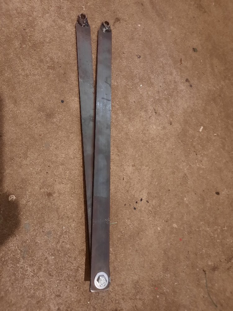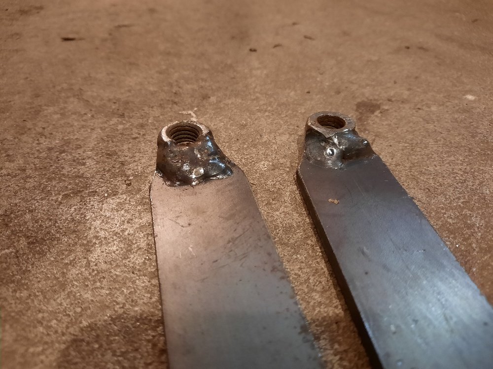 Zum Gegenhalten beim Lösen der Schraube (SW36) habe ich mir auf die Schnelle aus zwei Flacheisen und 2 aufgeschweißten Muttern dieses Hilfswerkzeug gefertigt.