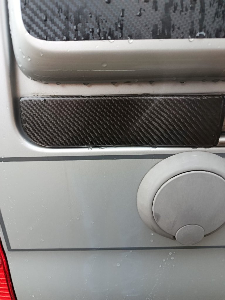 Ich habe mir den KITT-Träger gekauft, fand aber das Zubehör (inklusive der Aluminium-Staukästen) ziemlich teuer. Da ich viele Carbonteile für Motorräder herstelle, habe ich meiner Fantasie freien Lauf gelassen und ein paar Carbonteile für meinen Campervan gebaut. Sie gefallen mir gut, und sie sind sehr leicht. Ich weiß, dass es bei einem Campervan mit rund 3000 kg nicht viel ausmacht, aber die Geste zählt… haha.