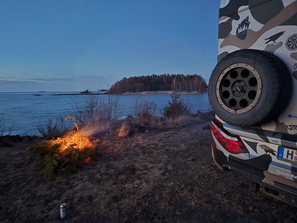 Lagerfeuer am gefrorenen Vänern in Schweden. Bisher leider noch kein Schnee...