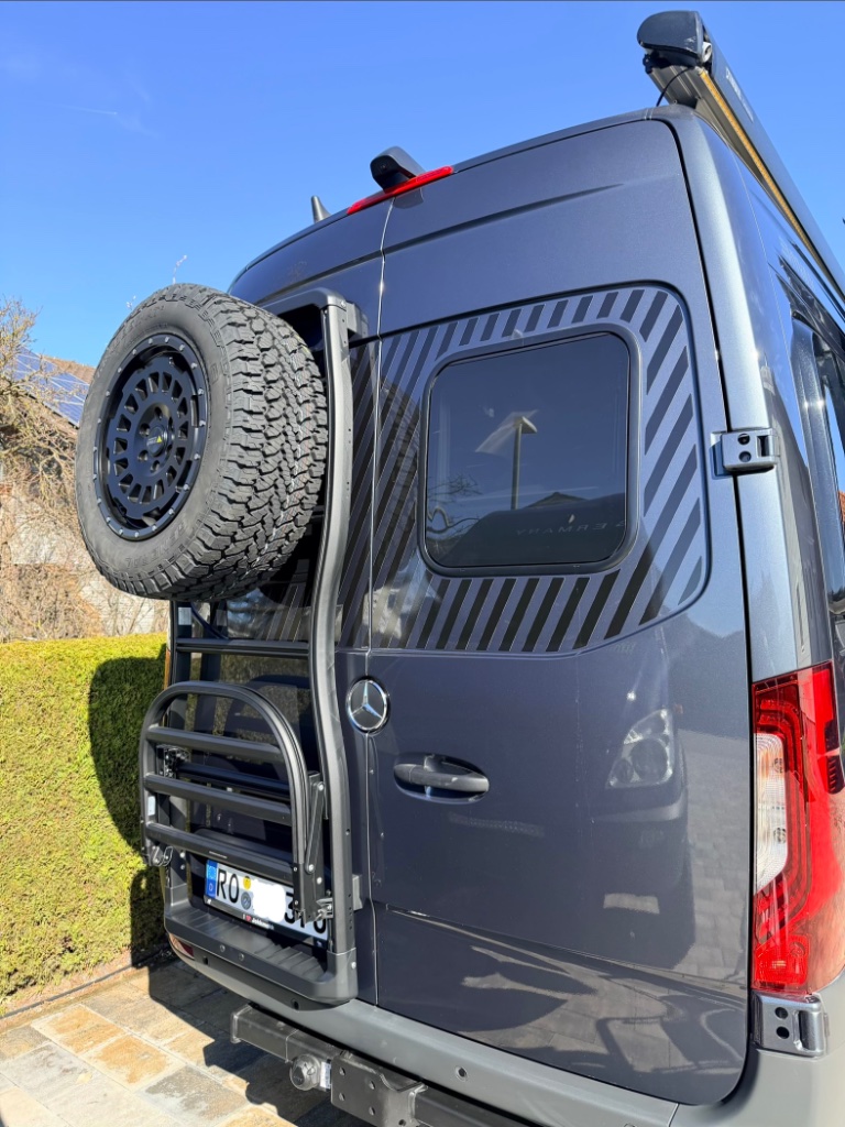 Nur Bei Auslandsfahrten in Länder, wo das egal ist,und ich unbedingt beides brauche, lass ich das Ersatzrad oben und das MiniRack in der unteren Position. Das ist zwar nicht 100 % legal, fällt aber in der Praxis kaum auf, da es die Lichter so gut wie nicht verdeckt. Vor allem, wenn es ganz in die Fahrzeug Mitte geschoben ist.