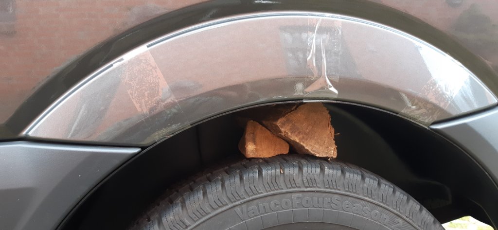 und dann mit Paketkleber grob fixiert. Um mehr Stabilität zu erreichen habe ich mit Kaminholz den Innenkotflügel zwischen Reifen und Radlauf verklemmt.