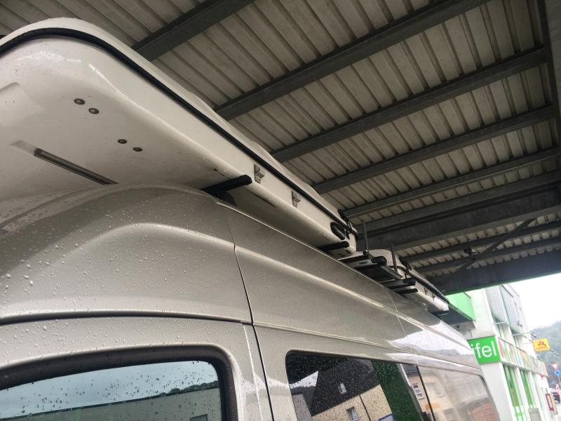 Vielleicht kannst du es ja mal auf das Dach auflegen und sehen ob es zwischen die Sicken passt. Ich möchte es möglichst weit hinten einbauen, aussermittig nach links.