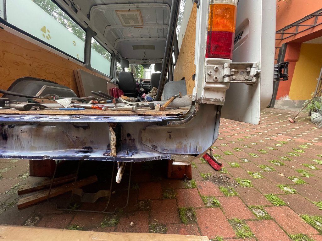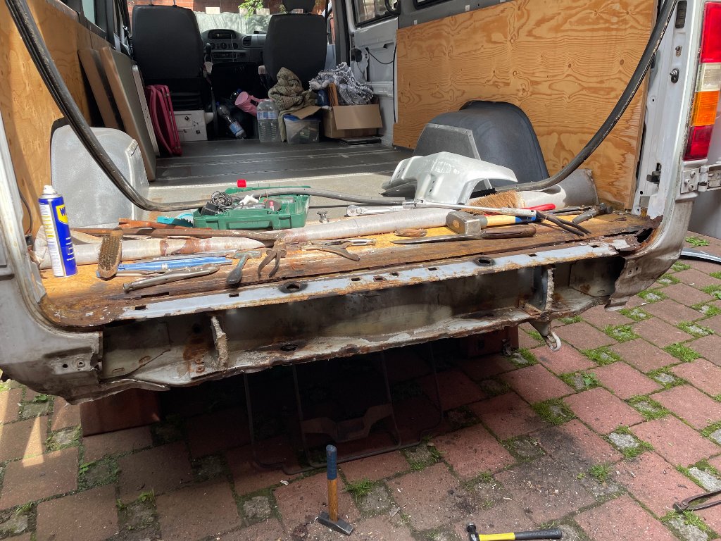 In dem Bereich des Heckabschlussbleches sammelt sich sehr viel Sand und sonstiger Dreck. Hier habe ich sehr lange mit Druckluft alles herausgepustet bis nichts mehr herauskam. Dann alle Holräume sehr sorgfältig mit Holhlraumwachs ( Vaselinemischung ) konserviert. Der Erstbesitzter hatte dieses schon bei dem Fahrzeug als Neuwagen durchführen lassen. Eventuell steht der Kasten deshalb noch so gut da.