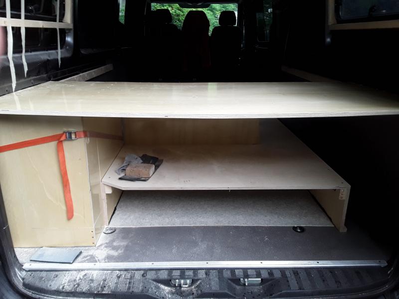 Die Unterkonstruktion für den doppelten Boden Fensterrahmen Ein Staufach ist schon fertig