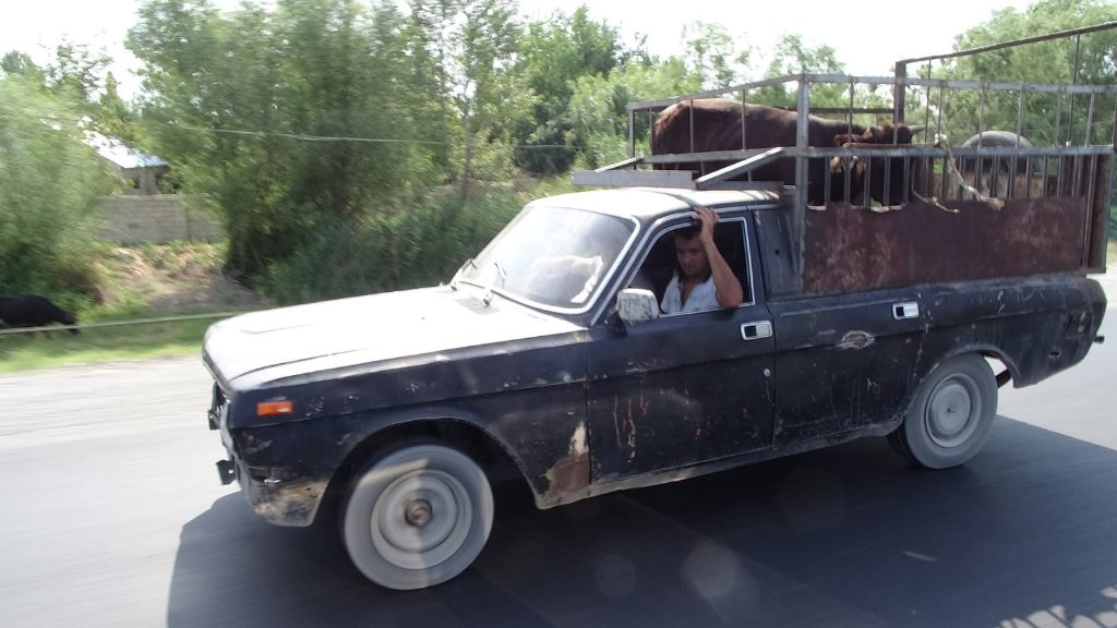 Zweites Bild Mitte: Ein alter sowjetischer Wolga M24 als Pickup umgerüstet, fährt seine Kuh zum Wochenmarkte