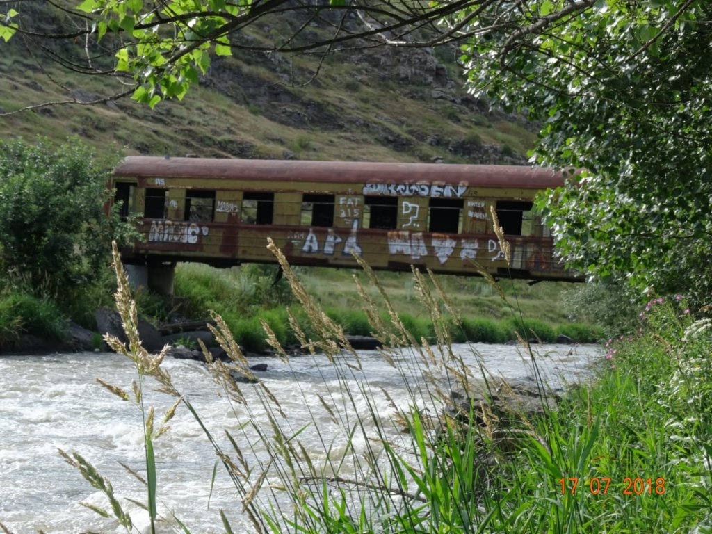 Drittes Bild unten: Mal eine echte "Eisenbahnbrücke" hier in Georgien, die zu passieren, war allerdings ein waghalsigens Unterfangen, da innen der Boden fast durchweg fehlte.