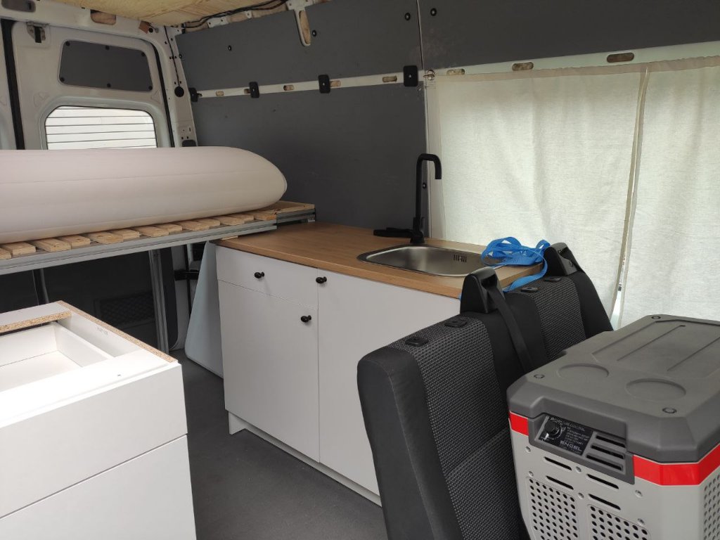 - Küchenzeile 1,20 x 0,60m mit Spüle, Wasserhahn (20L Frisch und 20L Abwassertank), 40L Engel Kühlbox auf Schwerlastauszügen