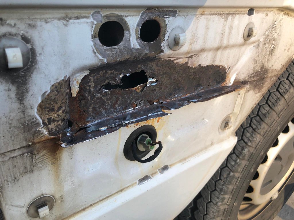 Weiß jemand warum Mercedes auf diese großen Löchter einfach Klebeband aufklebt und dann lackiert? Diese sind mit der Zeit natürlich abgefallen und das Wasser läuft hinten in den Innenraum.