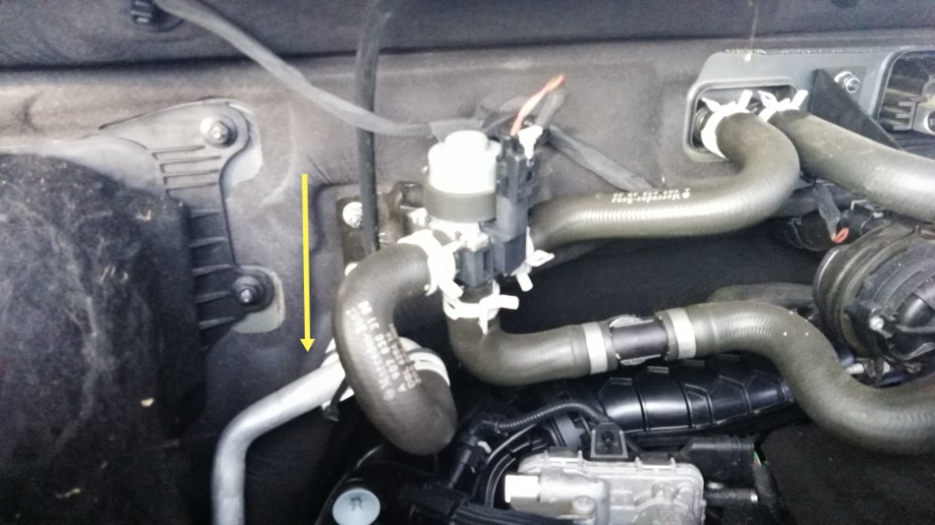 Die Fehlfunktion der Standheizung H12 wurde gleich nach Auslieferung reklamiert. MB war hilflos. Kurz darauf gab es eine Änderung in der Betriebsanleitung wonach nur noch der Innenraum beheizt wird. Möglicherweise ist auch das Verteiler Ventil entfallen. Durch Eigenversuch habe ich folgende Lösung gefunden. Wenn die Standheizung läuft, erwärmt sich der Kreislauf zum Wärmetauscher Innenraum (Draufsicht nach rechts). Der Kreislauf zum Motor (Pfeil) bleibt kalt. Jetzt das Kabel abziehen (ist ein wenig trickig) und der Kreislauf zum Motor wird warm (Hand auflegen). Ich fahre nur noch mit abgezogenem Kabel Innenraum und Motor werden gleichmäßig erwärmt. Nach 45 Min. hat der Motor 70°.
