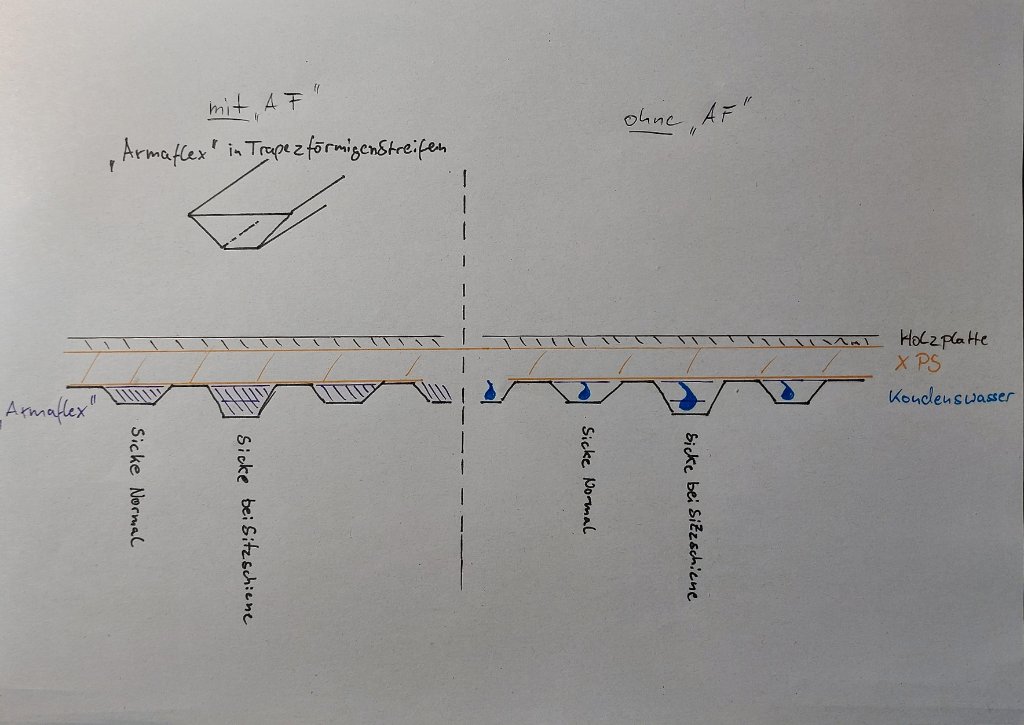 Entweder Armaflex und das muß vollflächig verklebt werden dann ist der Taupunkt im Armaflex oder XPS Platten oben auf die Sicken kleben. Die dadurch entstehenden Hohlräume wirken wie eine Hinterlüftung sollte der Taupunkt einmal nicht in der XPS Platte sein.
